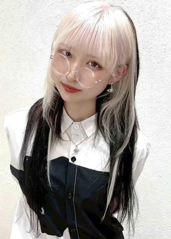 後ろの下半分と 両サイドのこめかみ下あたりに たっぷりブリーチハイライトを施し、 トップはプラチナブラウンでトーンダウン。 ハイライト部分にはグレー…